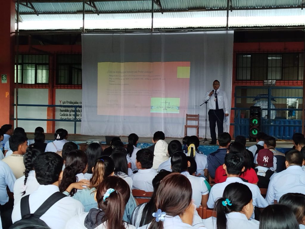 El día de hoy se llevo acabo una chala informativa por parte del Modulo Básico de Justicia Requena representado por el Mag. Daniel Ricardo Maldonado Vela, dando a conocer el rol que cumple el Poder Judicial ante nuestra sociedad, tocando temas importantes como: conocer los órganos de Justicia, como llevan acabo los procedimientos y que hacer para poder solicitarlo y el camino que se debe seguir para hacer valer nuestros derechos.