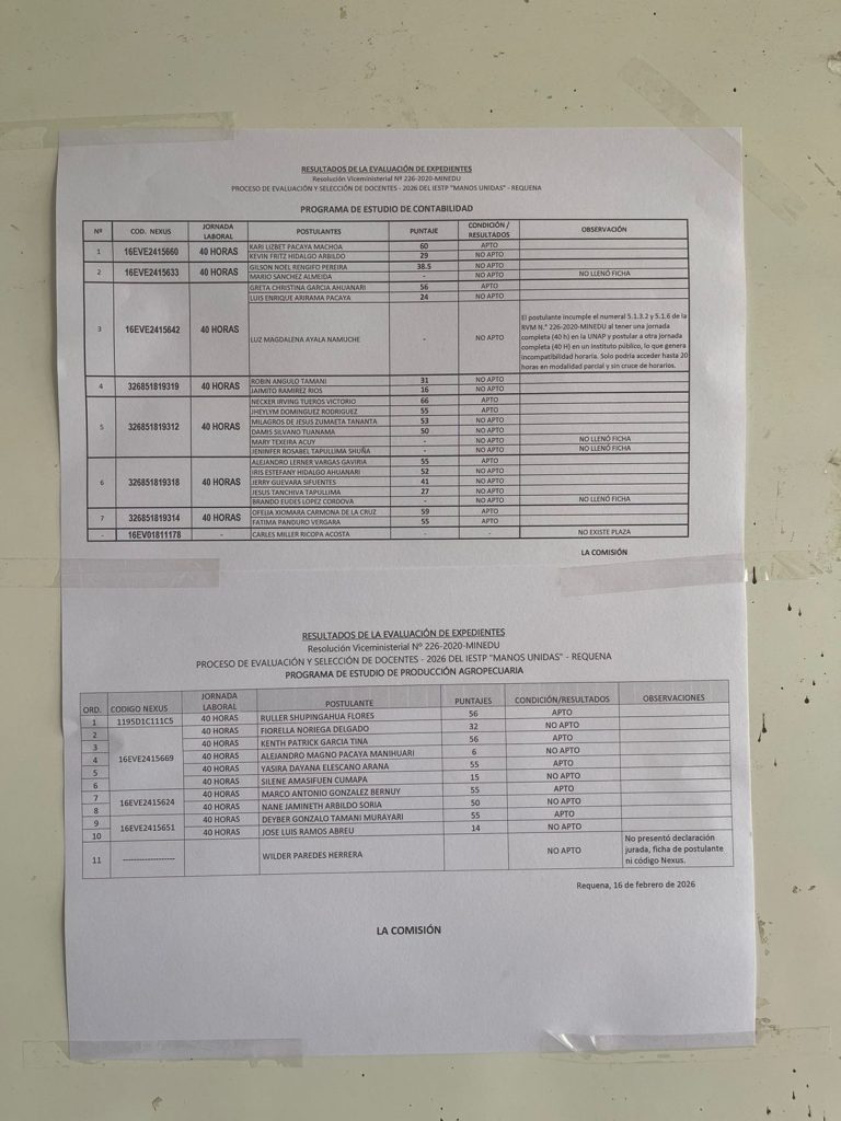 En cumplimiento del cronograma establecido en el CONCURSO PÚBLICO DE MÉRITOS ABIERTO DE DOCENTES REGULARES EN INSTITUTOS DE EDUCACIÓN SUPERIOR TECNOLÓGICA PÚBLICOS – 2026 -REGIÓN LORETO, EN EL MARCO DE LA RVM N° 226-2020-MINEDU, se informa a la comunidad educativa y al público en general que los resultados parciales han sido publicados conforme a las fechas programadas, por este medio y en la pizarra informativa de nuestra institución.